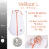 Tento spací vak veľkosti L, je vhodný pre deti od 12-18 mesiacov, pri výške dieťaťa od 78-88 cm a váhe od 10 - 13kg. Dôrazne neodporúčame zhotovovať väčšie spacáček s presvedčením, že dieťa do neho čoskoro dorastie, riaďte sa prosím danými parametrami. Otvor pre hlavu dieťaťa bol veľmi starostlivo navrhnutý, môžete si byť istí, že ak zvolíte správnu veľkosť spacáčku, dieťa neprekĺzne dovnútra.