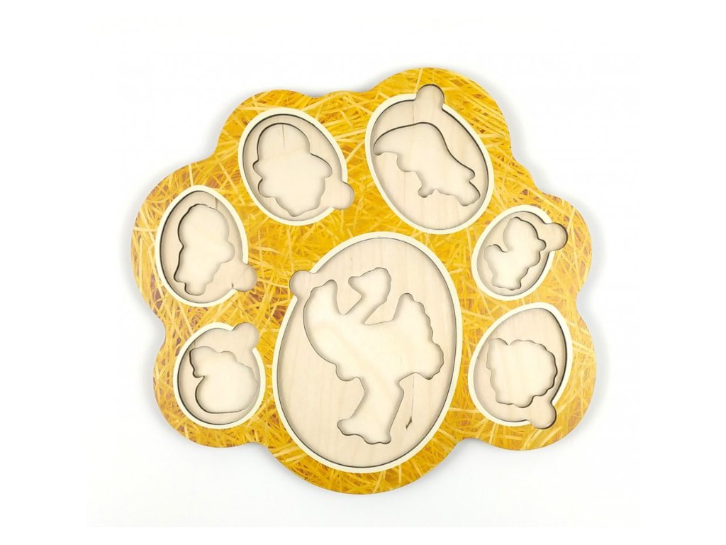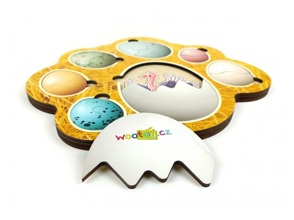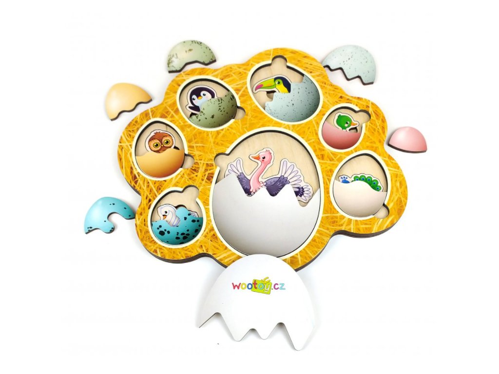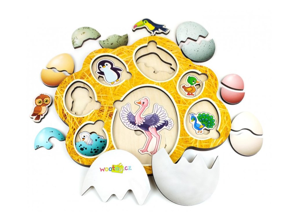 Drevené vkladacie puzzle Vajcia sa skladá z dvoch vrstiev a 21 dielov. Dieťa sa podľa obrysov a tvaru snaží nájsť správny obrázok